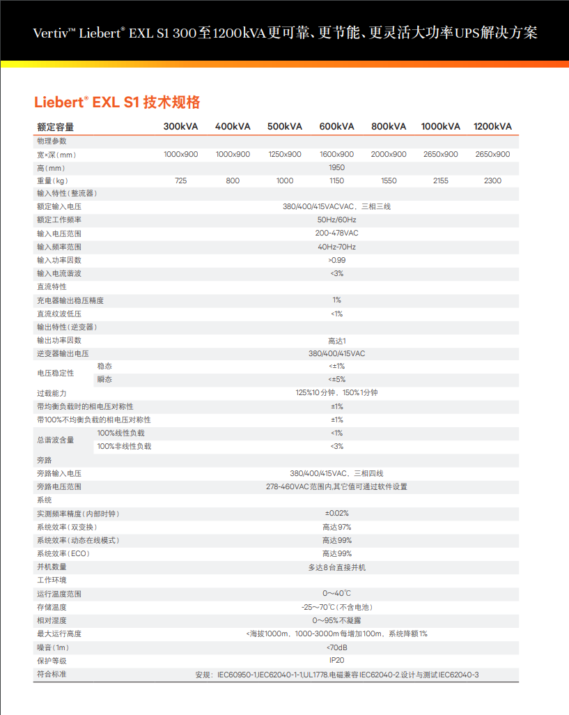 Vertiv Liebert EXL S1 是一款更可靠、更高效、更灵活的高频一体化UPS产品,整流器和逆变器均采用三电平技术,双转换效率高达97%,并可通过智能并联提升轻载下的效率.*新推出的动态在线模式,在确保IEC 62040 1类供电质量和高可用性的前提下,可以提供高达99%的运行效率。 EXL S1拥有卓越的运行成本,降低了TCO 和 CO2 排放。