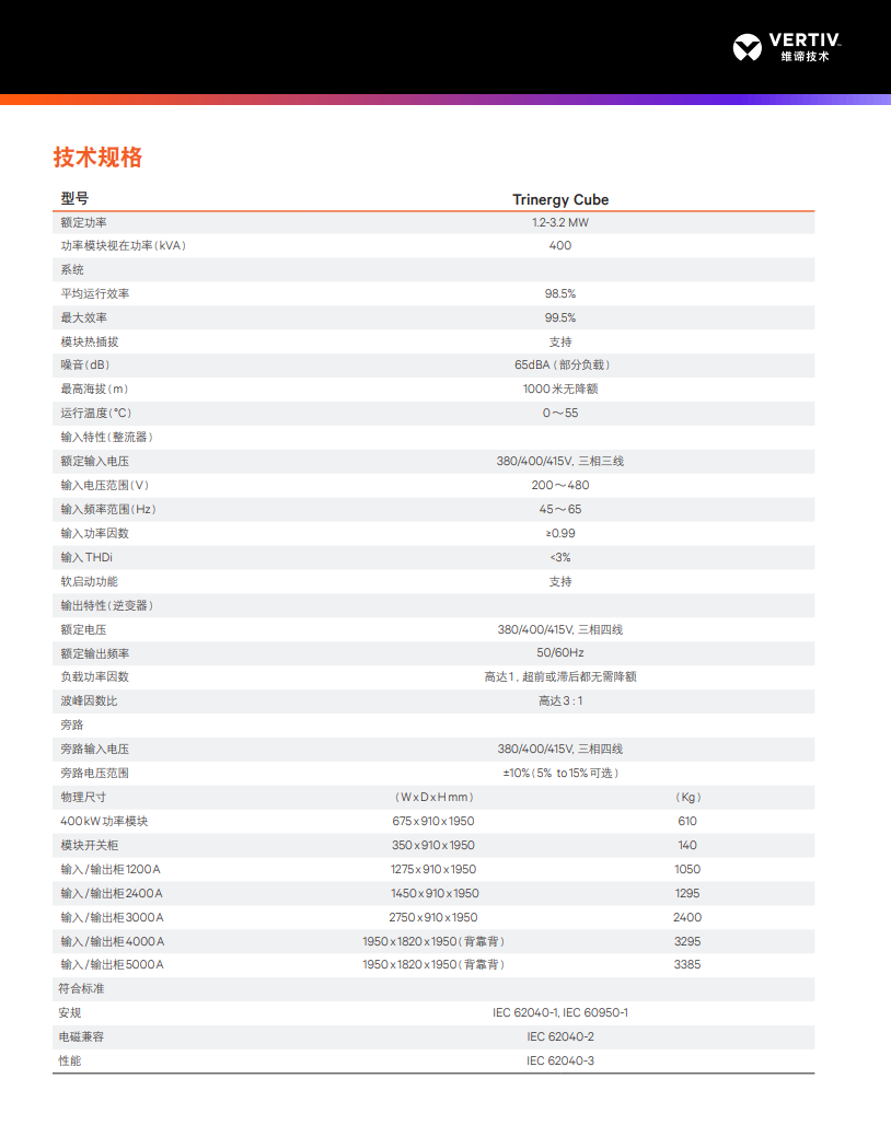 Liebert® Trinergy™ Cube是一款MW级的智能调控型UPS供电系统,经长期运行验证可用性达到了99.99999%。适用于关注高可靠,高效节能和高可维护性的MW级大型数据中心,包括超大型互联网公司、大型金融机构以及大型数据中心托管运营商。